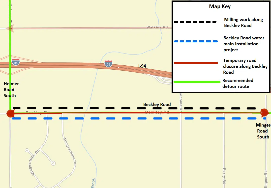 Beckley Road between Helmer Road South and Minges Road South will be undergoing milling work. It is currently closed to thru traffic, due to the water main project:
